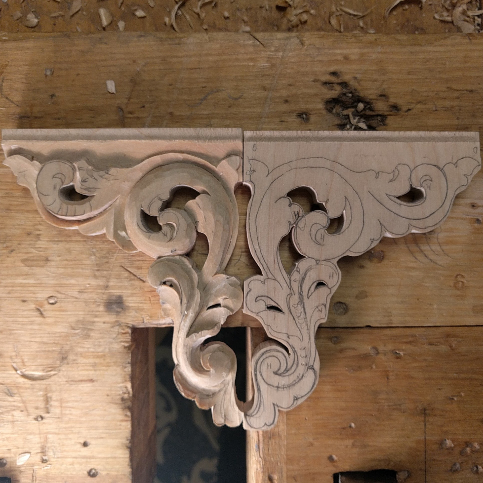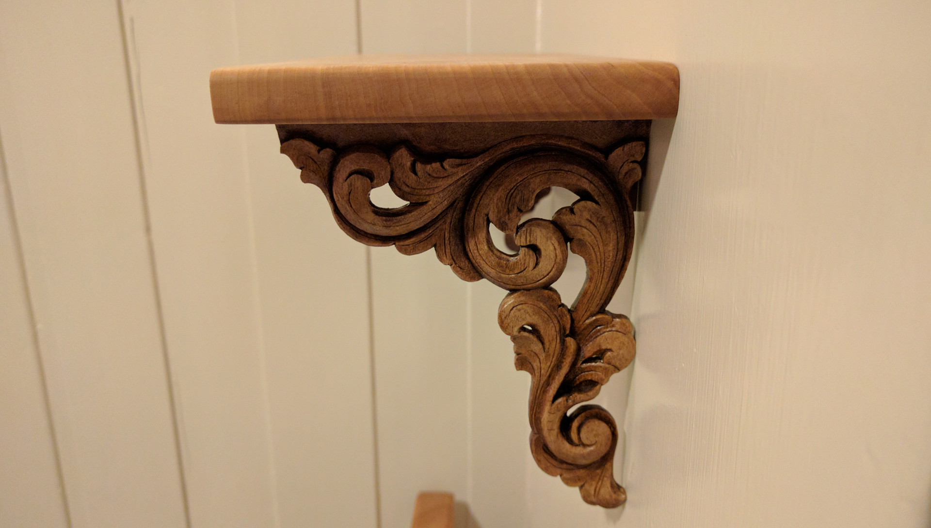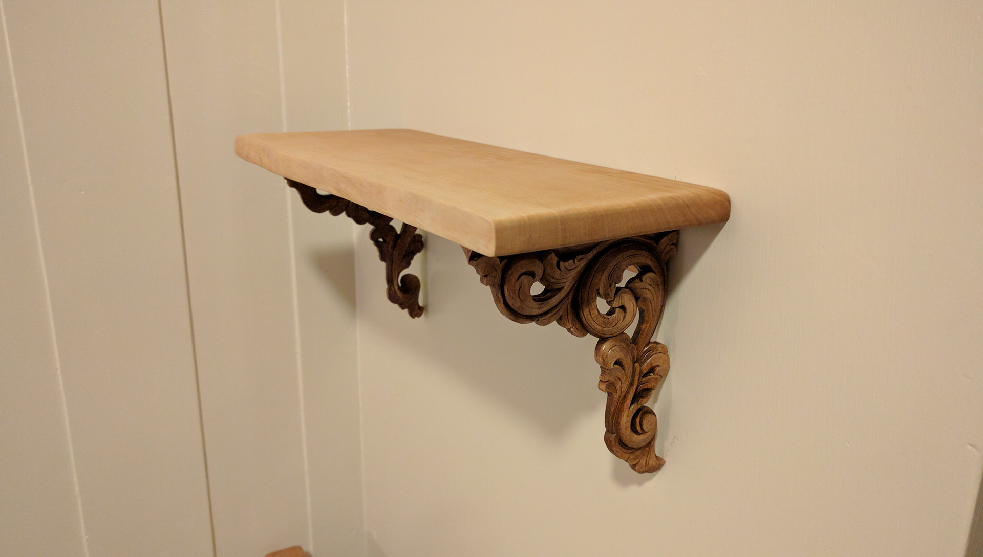 This shelf features hand-carved acanthus brackets and a raw-edge shelf top joined by sliding dovetails, finished with a pigmented oil technique called lasuring.