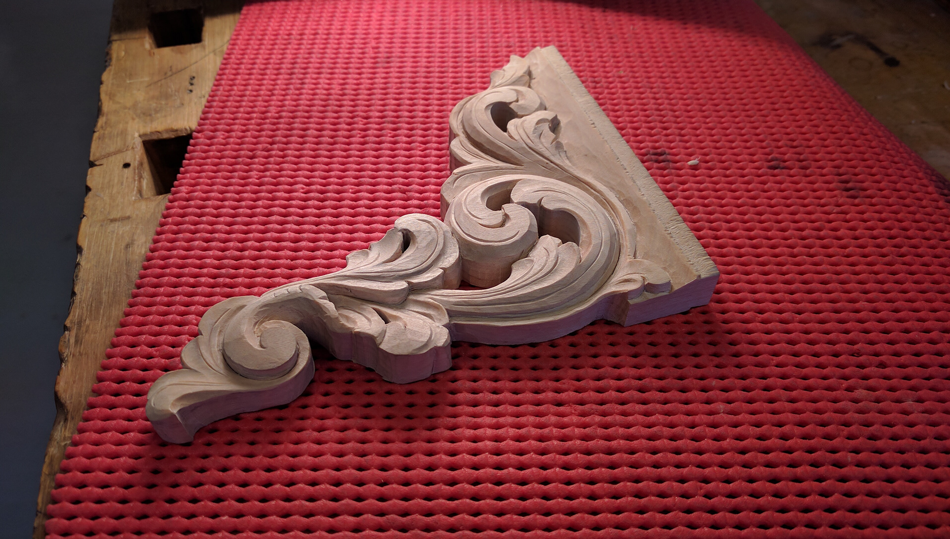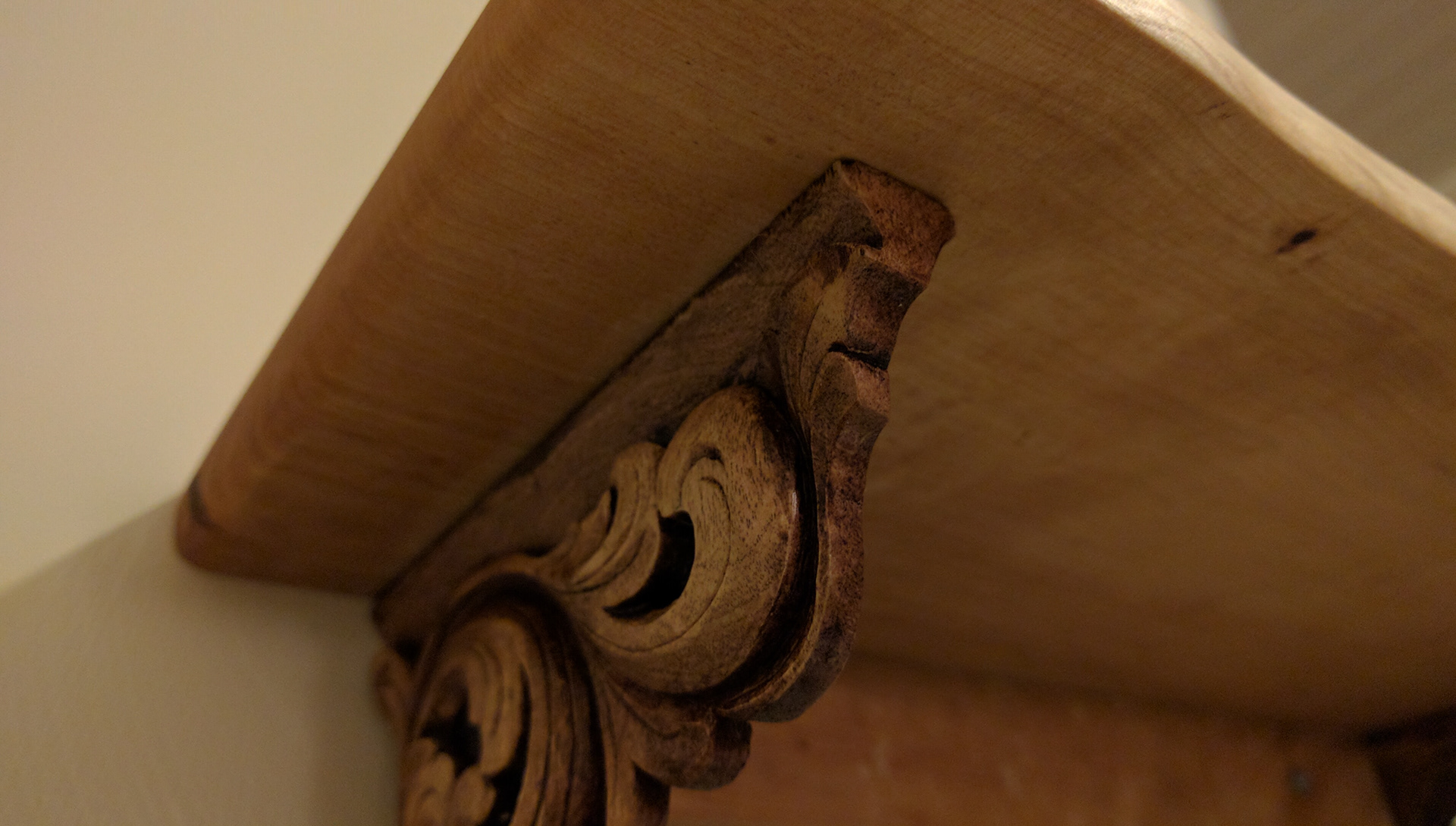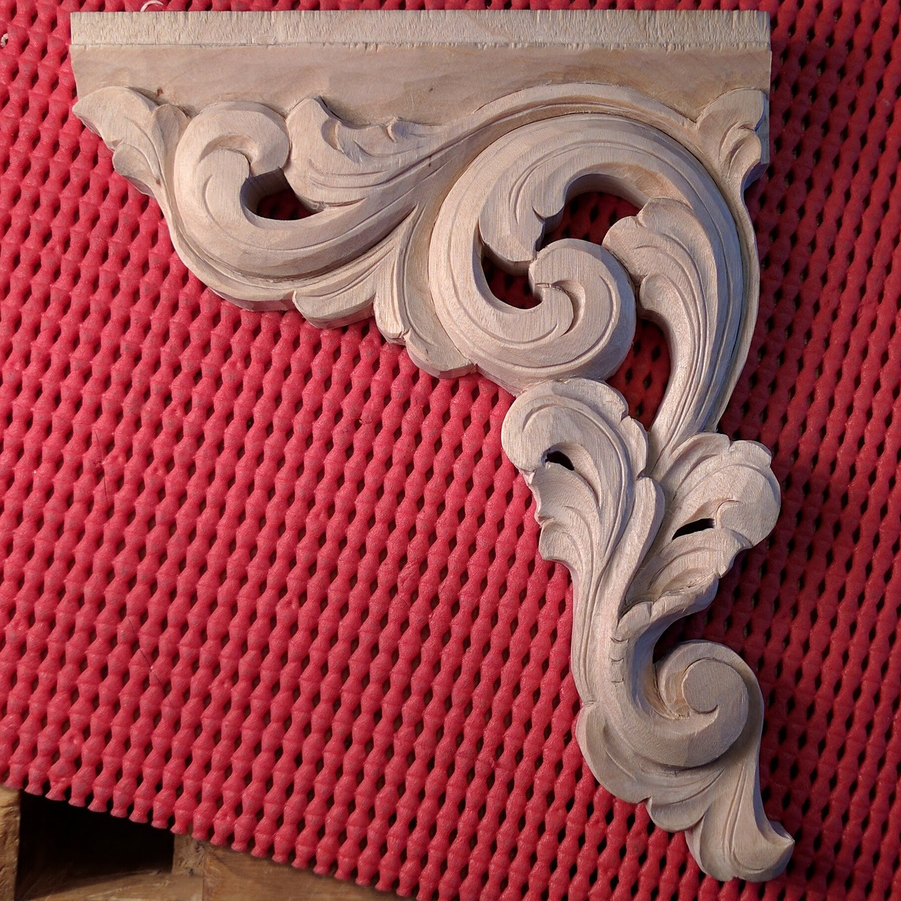 This shelf features hand-carved acanthus brackets and a raw-edge shelf top joined by sliding dovetails, finished with a pigmented oil technique called lasuring.