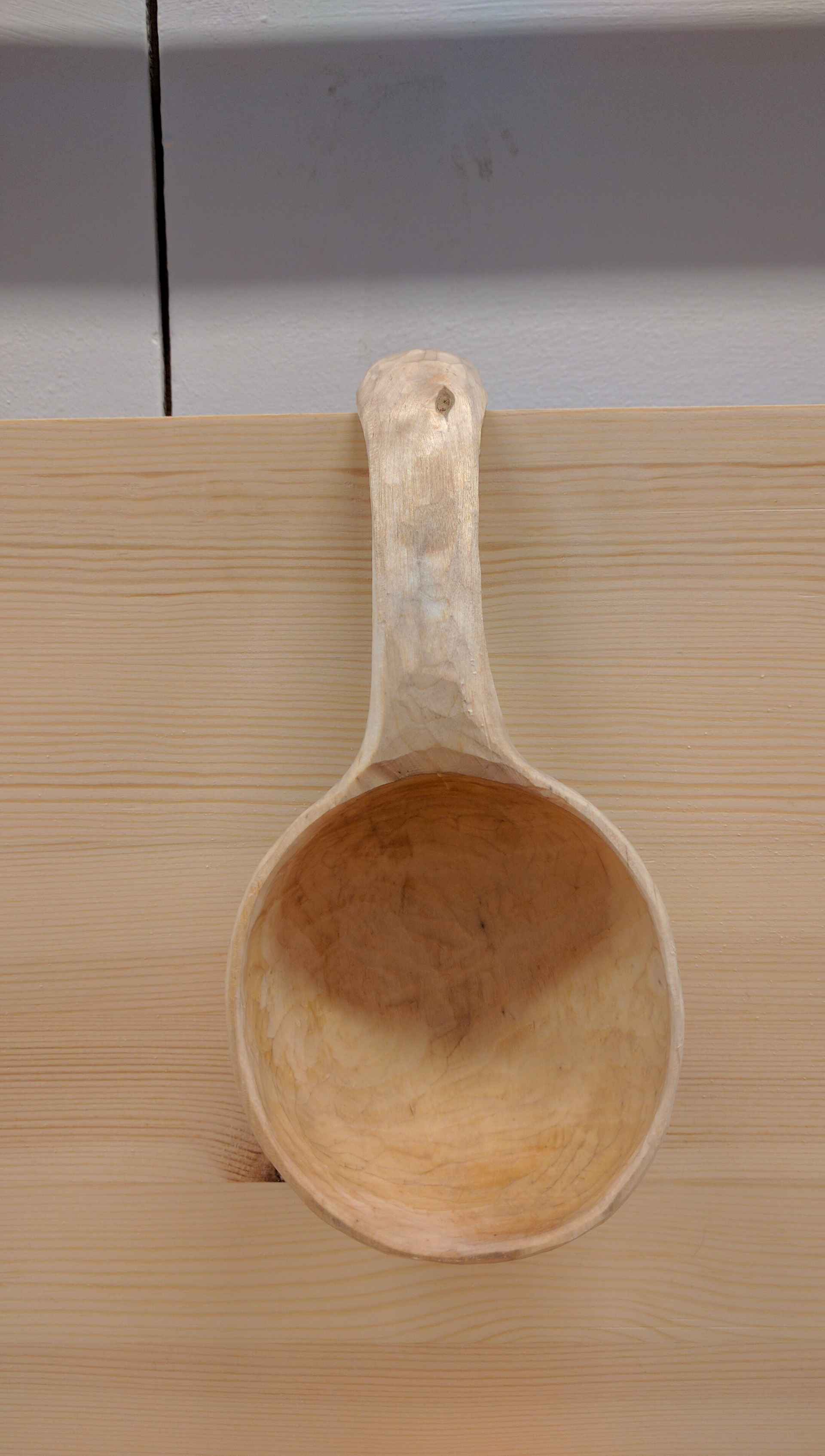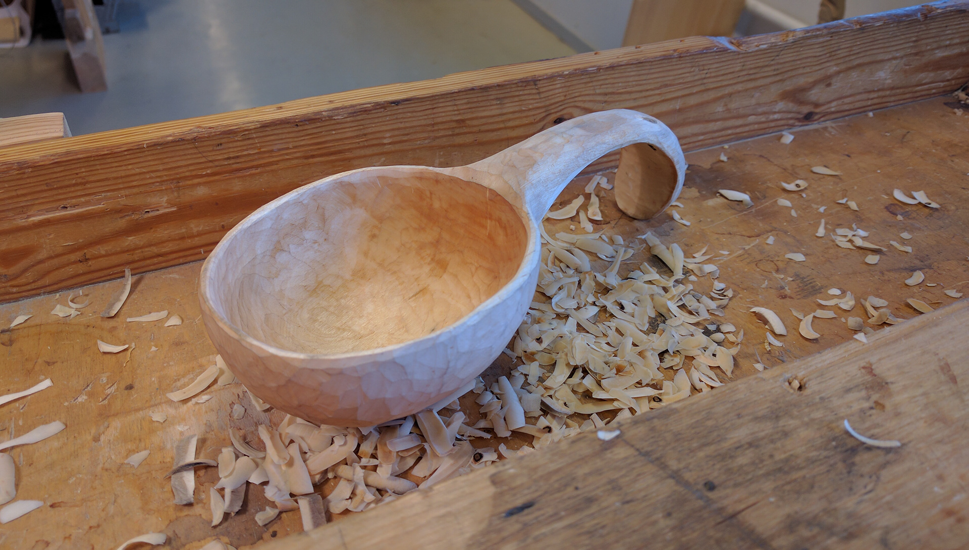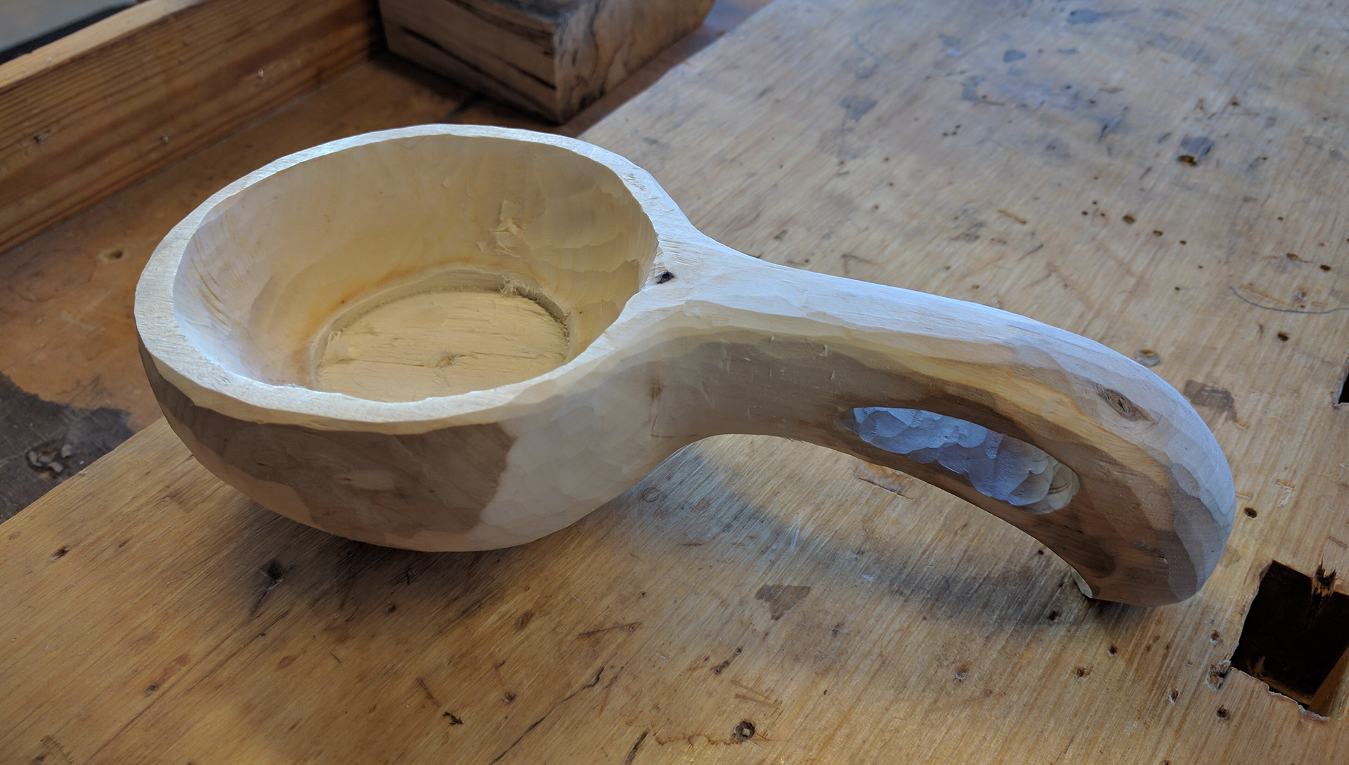 A hand-carved camp or hiking cup, carved from uncured silver birch